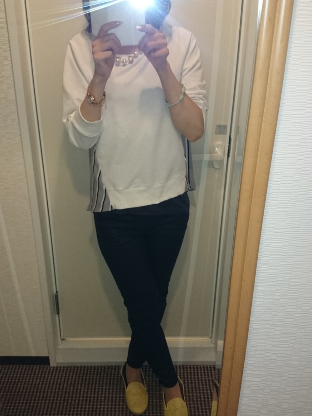 きれいめカジュアルを目指してます。 トレンドのストライプ柄のプルオーバー にパールのアクセと黄色のぺたんこ靴でアクセントにしてみました。 このカットソー、背中側が全面ストライプになってて可愛いです♡ いっぱい歩きたい時の楽ちんコーデです(*^^*)