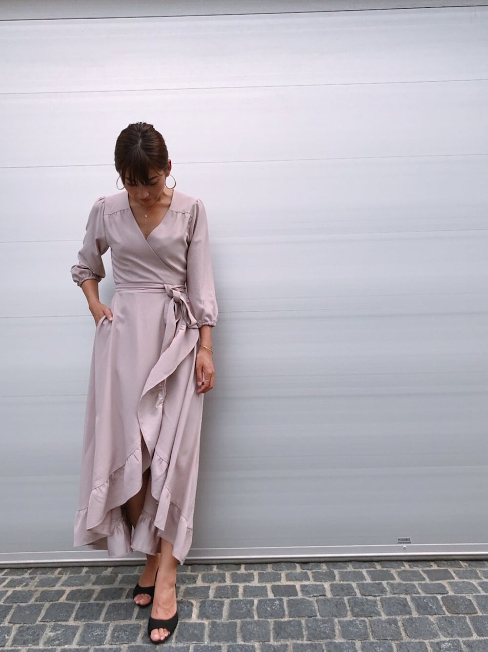 このワンピース本当にキレイ♡ 私はカジュアルにも着たいからスニーカー合わせたりキャスケットかぶったり小物で遊んでいます😊 光沢もない生地なのでキレイめになりすぎないで 🙆
