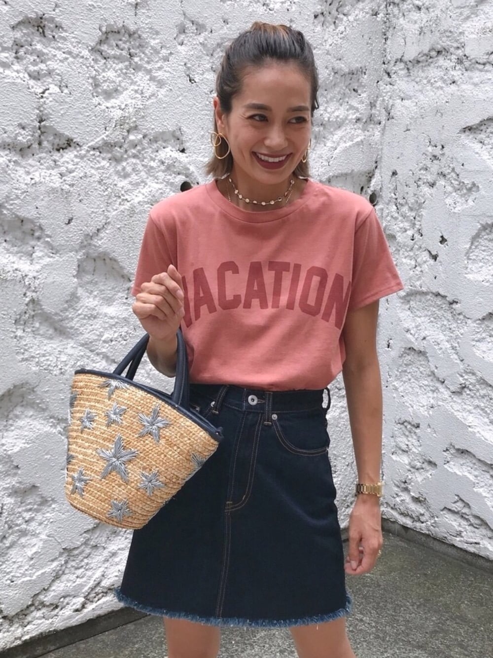 秋の新作denimスカート❤️ ワンウォッシュのスカート大人ですき😌 Tシャツのカラーと合う😌 今日は台風🌬なので1日気をつけてくださいね🙇🏼♀️