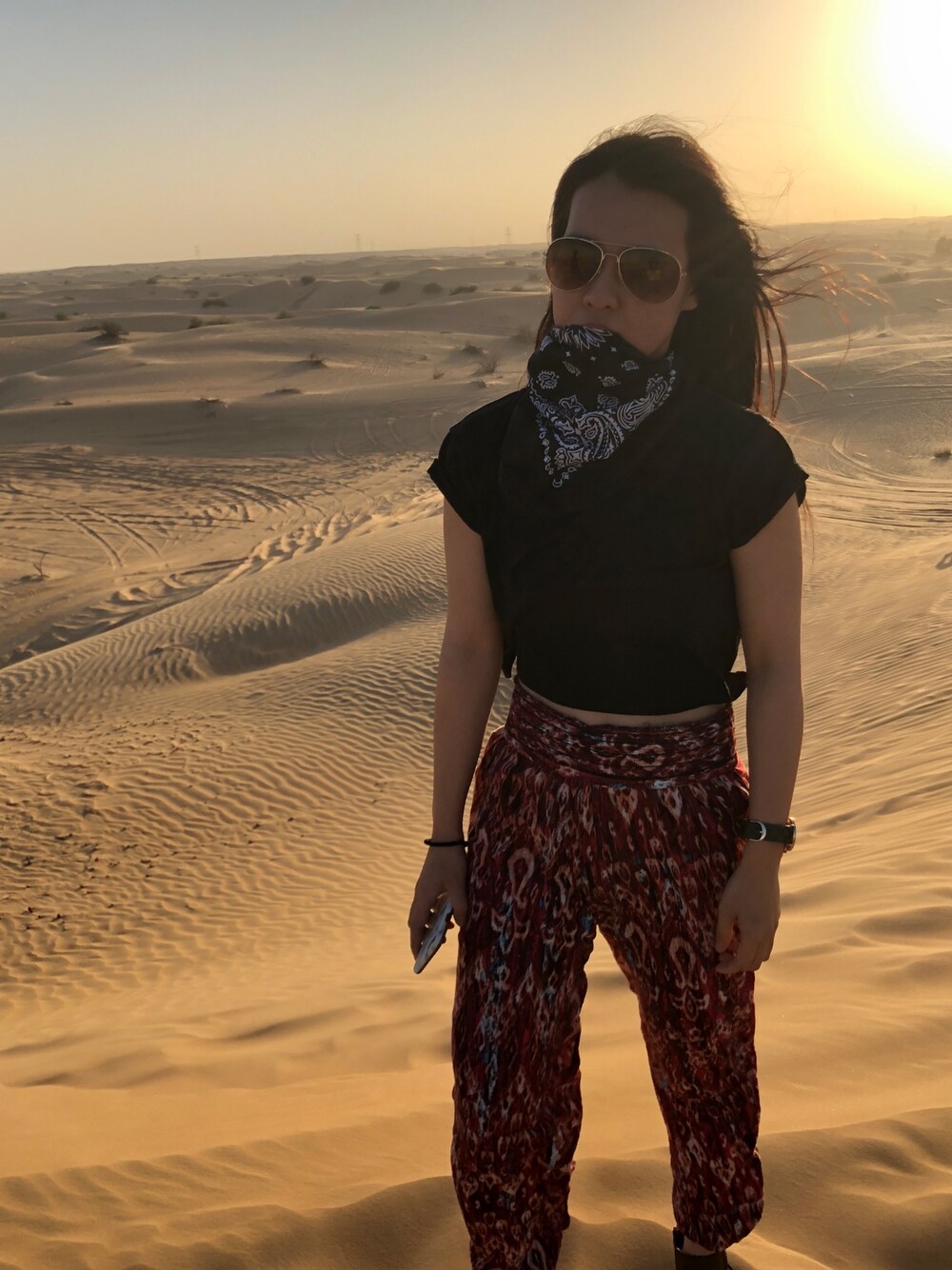 砂漠コーデ🐫🇦🇪🌵 砂がきめ細かすぎて風で ものすごく舞うので 口と眼球を保護👌 Dubaiでカウントダウン 最高でした!