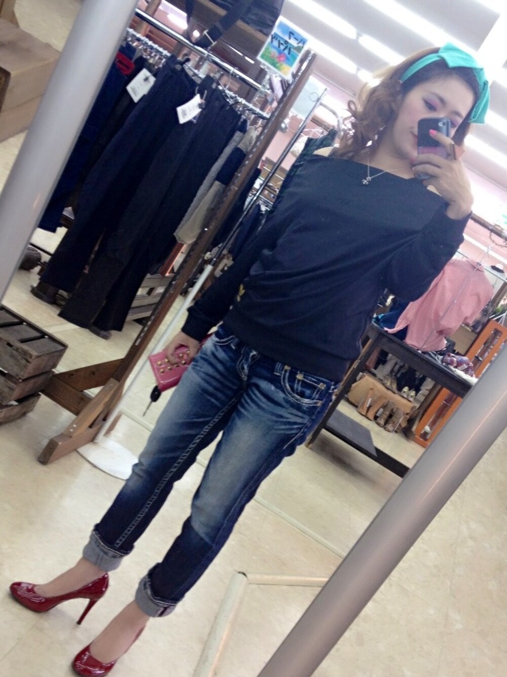 adidasのレアオフショルに可愛らしくリボン! 赤パンプスはナインウェスト!