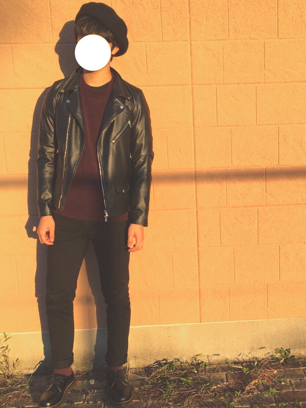 ベレー帽とライダースの甘辛コーデ🙃 ニットと靴下の色をボルドーで合わせてクリスマスっぽく🤓