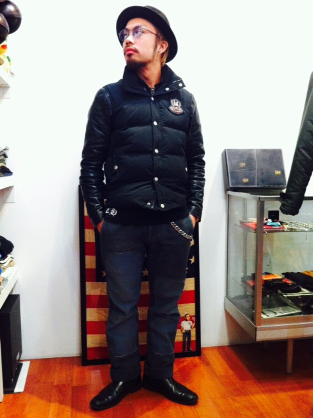 Mitsu 170cm 62kg ・HAT: NEW YORK HAT× HTC ALL UNBRELLA/スタッズ中折れフェルトハット(Black) ・VEST: MOSCHINO DOWN VEST (Black) ・インナー: Nudie jeAns Lether Jacket / JONNY (Black) ・Bottoms: RRL denim P/T ・Boots : SENDRA サイドゴアブーツ (Black) ・Walletチェーン: CHROME HEATS ・サングラス: NEWMAN