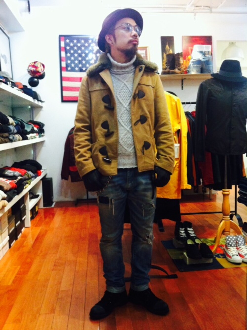 アウター:SHADES of GREY インナー:SCHOTT NYC ボトムス:REIGN ブーツ:Rosso Artigiano ハット:CA4LA サングラス:NEWMAN ウォレットチェーン:CHROME HEATS ベルト:HTC グローブ:GLOVES