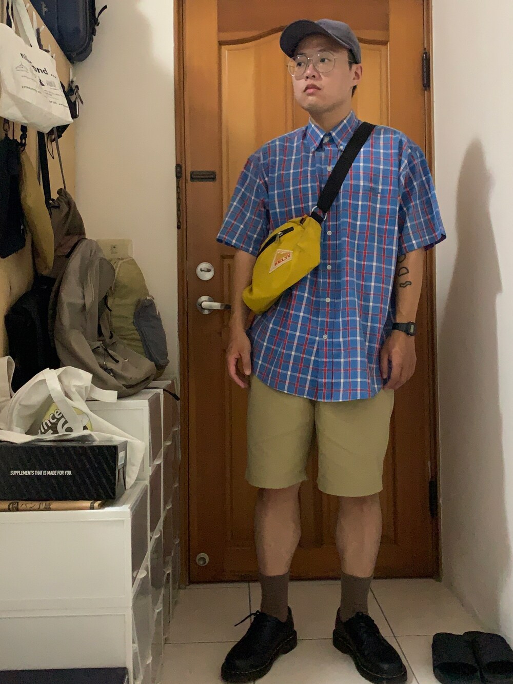 ベージュ系のカーゴパンツ、イエロー系のメッセンジャーバッグ、グレー系のキャップを着用したメンズの夏コーディネートの1枚目の写真