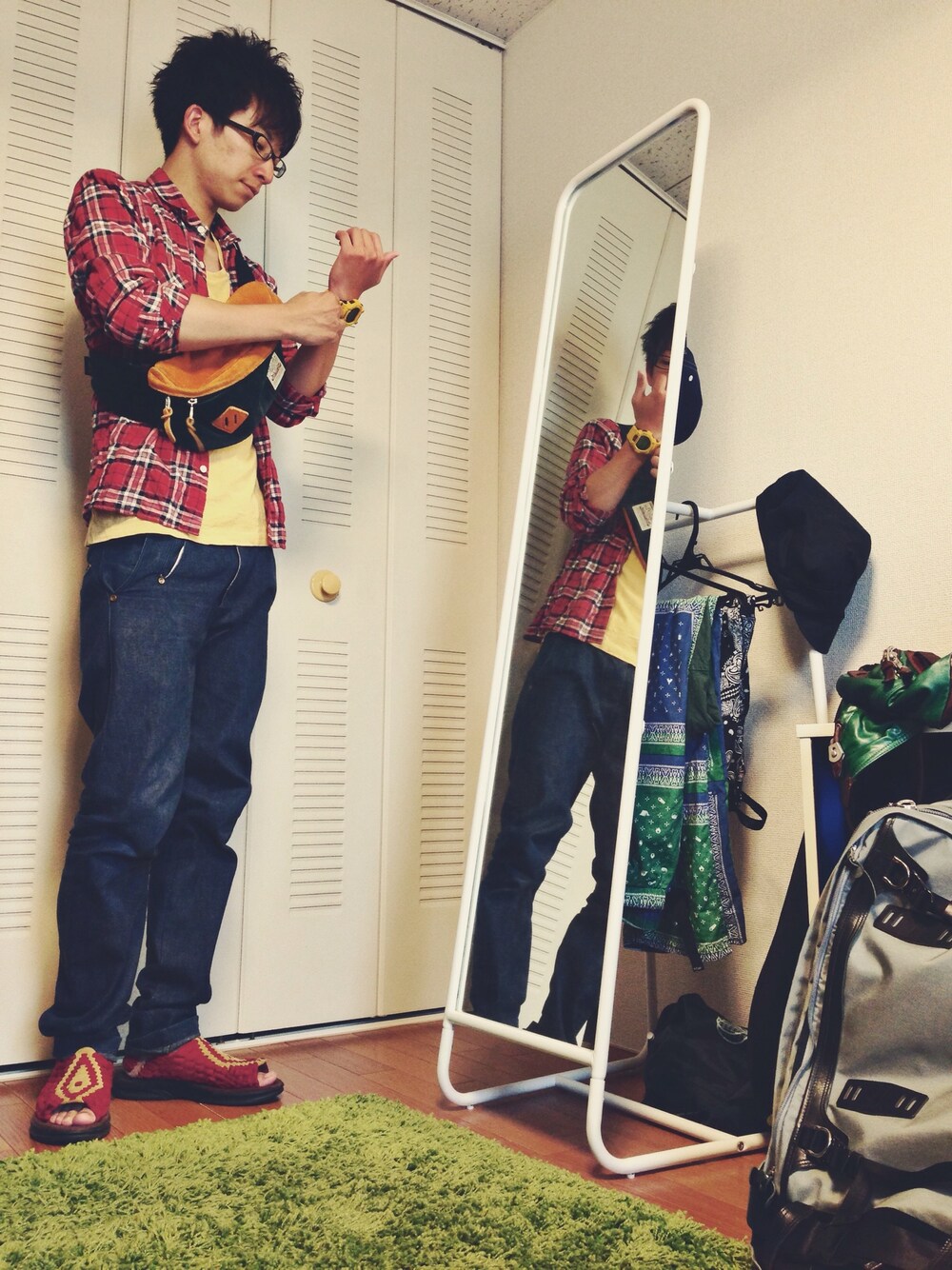 アイテムの使い方自体はシンプルですが、信号機カラーっぽく色をまとめました。。。 シャツ・サンダル=赤 Tシャツ・時計=黄 パンツ・バッグ=青 的な。