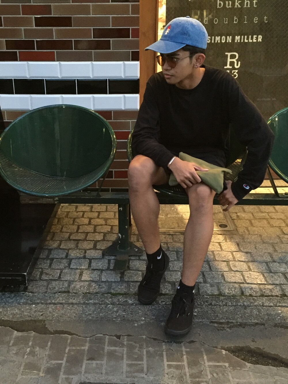 こうみえて高2です。 この時は寒いのか暑いのかよくわかんなかったから、天気にムカついて、上はchampionのロンT下はハーフパンツにしました! 全身黒にジーンズの色と緑みたいなよくわからない汚い色を組み合わせました! 安定の靴下NIKEでごさいます。