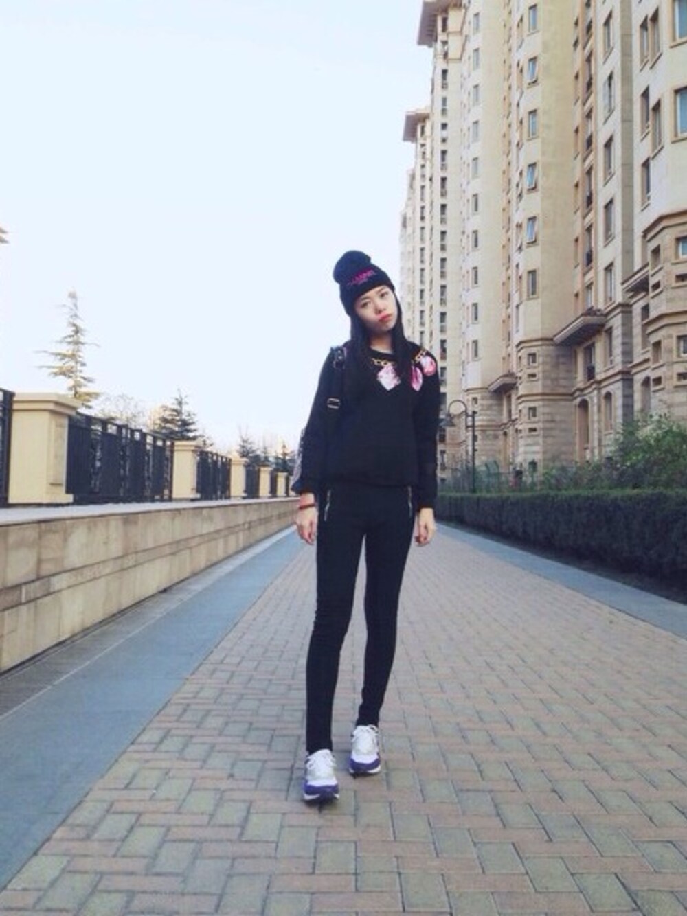 长裤+黑T+MCM双肩包+恶搞chanel帽子