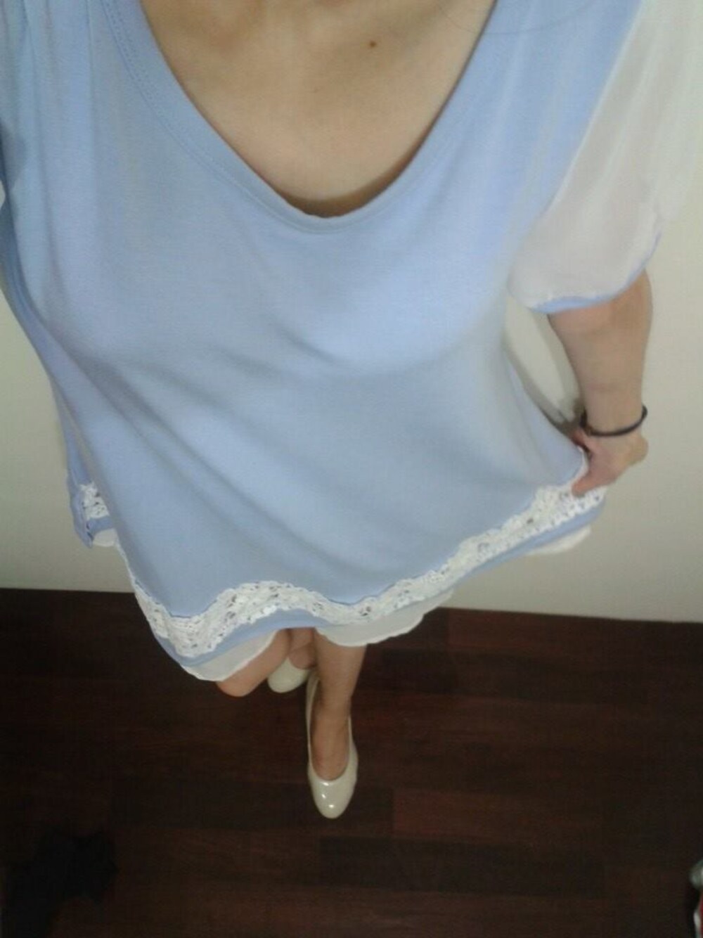 我搭配最簡單的米白色高跟鞋.正式場合例如婚宴或是聚餐都很適合.整體砍起來簡單清新大方.