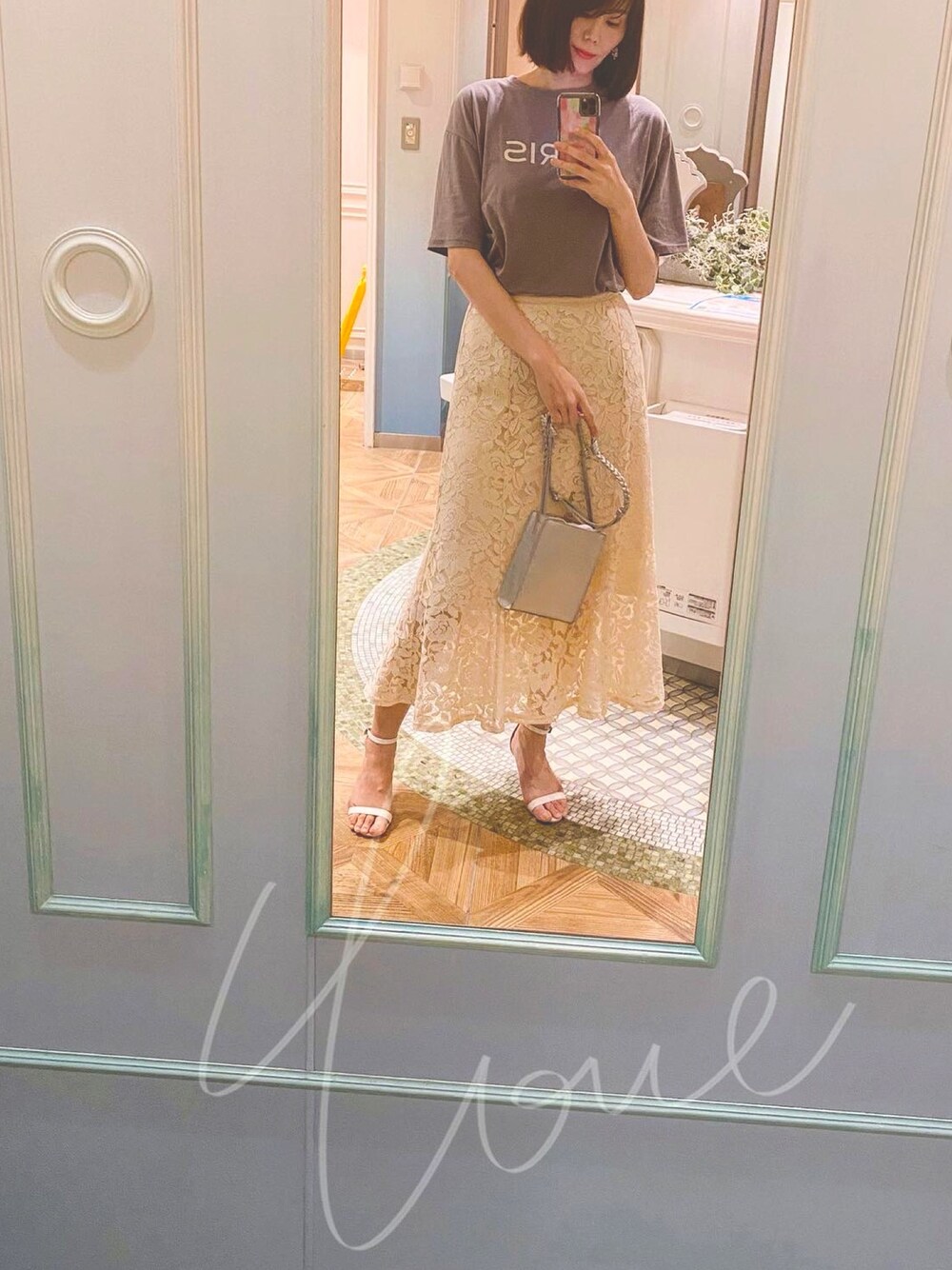 色のトーンを合わせて レーススカートにカジュアルな Tシャツを合わせて トーンを合わせるために シルバーのバックを合わせてみたよ