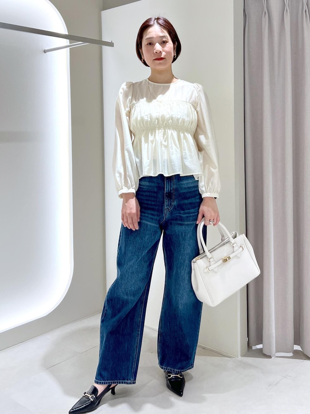 シンプルにデニムとブラウスで春っぽく合わせて見ました! 洋服がシンプルなので小物やアクセのゴールドのキラッと感がポイントになります♪
