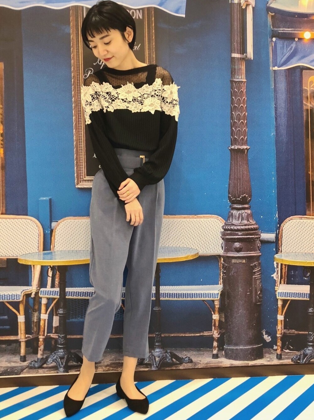 またまたミロードの撮影スポットで📸 パンツ青だから違うところで撮れば良かった🤦🏻♀️ 丈感いつもより短めな気がします! すっきりで脚長く見えるので皆さんも履いて見てください💓