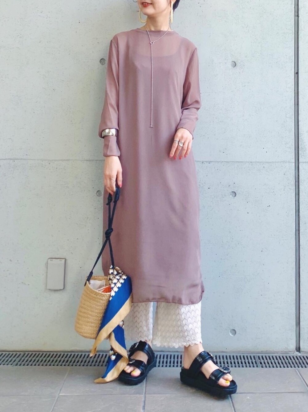 程良い透け感のシアーワンピース✩ パンツとのレイヤードスタイルもおすすめです☺︎ Instagram➪@yukky.1027