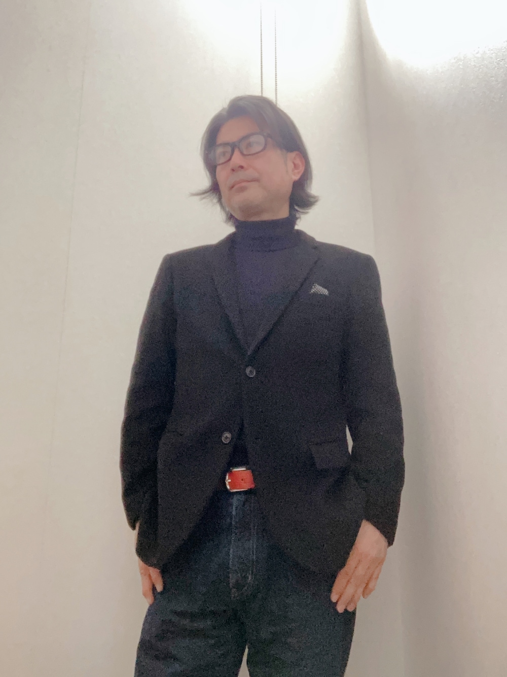 本日は法要 身内のみなので、ブラックジャケット 赤ベルトは、ニットで隠す ジャケットは、プラスJの2期目のカシミヤ混 もう、10数年もの 今季初めて着たが、もう3月