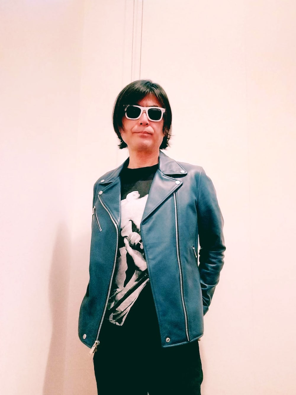 シンプルにロックTのブラックコーデ ま、Wライダースの定番的な組み合わせ プリントはTはNINEのTHE BLUE HEARTSのヒロト