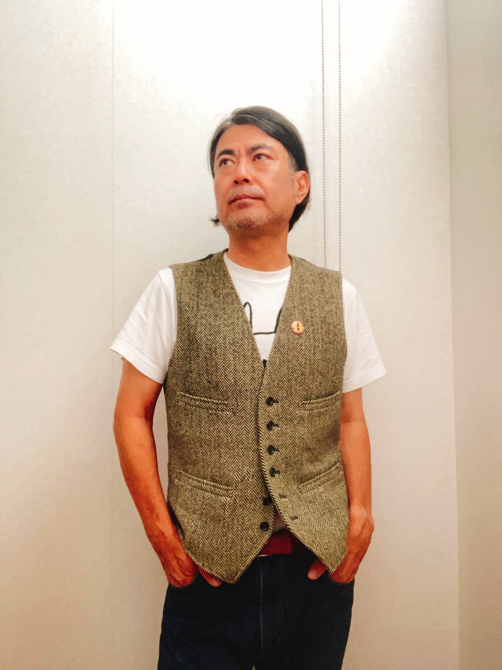ベストも冬素材に! ワンポイントは、THE BLUE HEARTSの缶バッヂ