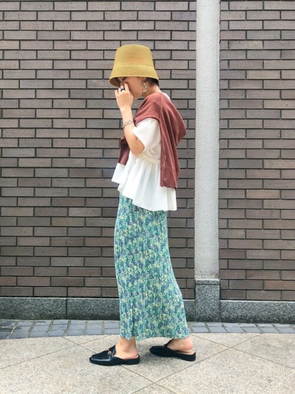 爽やかカラーのスカートで一気に夏コーデ☆ 夏らしいボタニカル柄のスカート 細かなプリーツとIラインのシルエットで細見え◎ 大人っぽく仕上げるためにダークブラウンを締め色に合わせました。