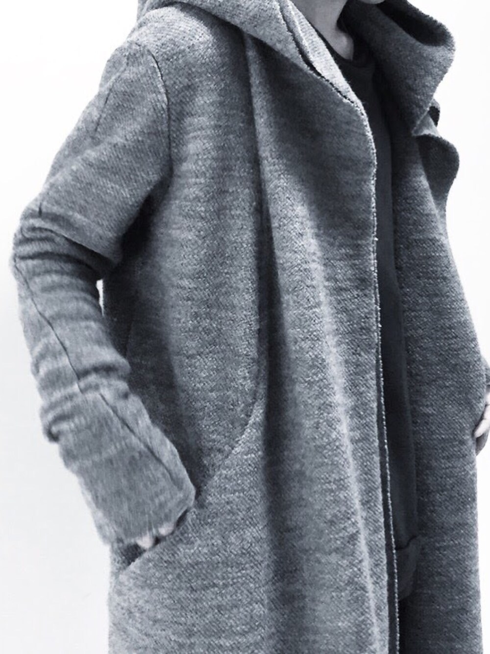 ちょっと肌寒い時期に羽織るだけで暖かいフーデットのニットカーディガン。 グレートーンで軽く。