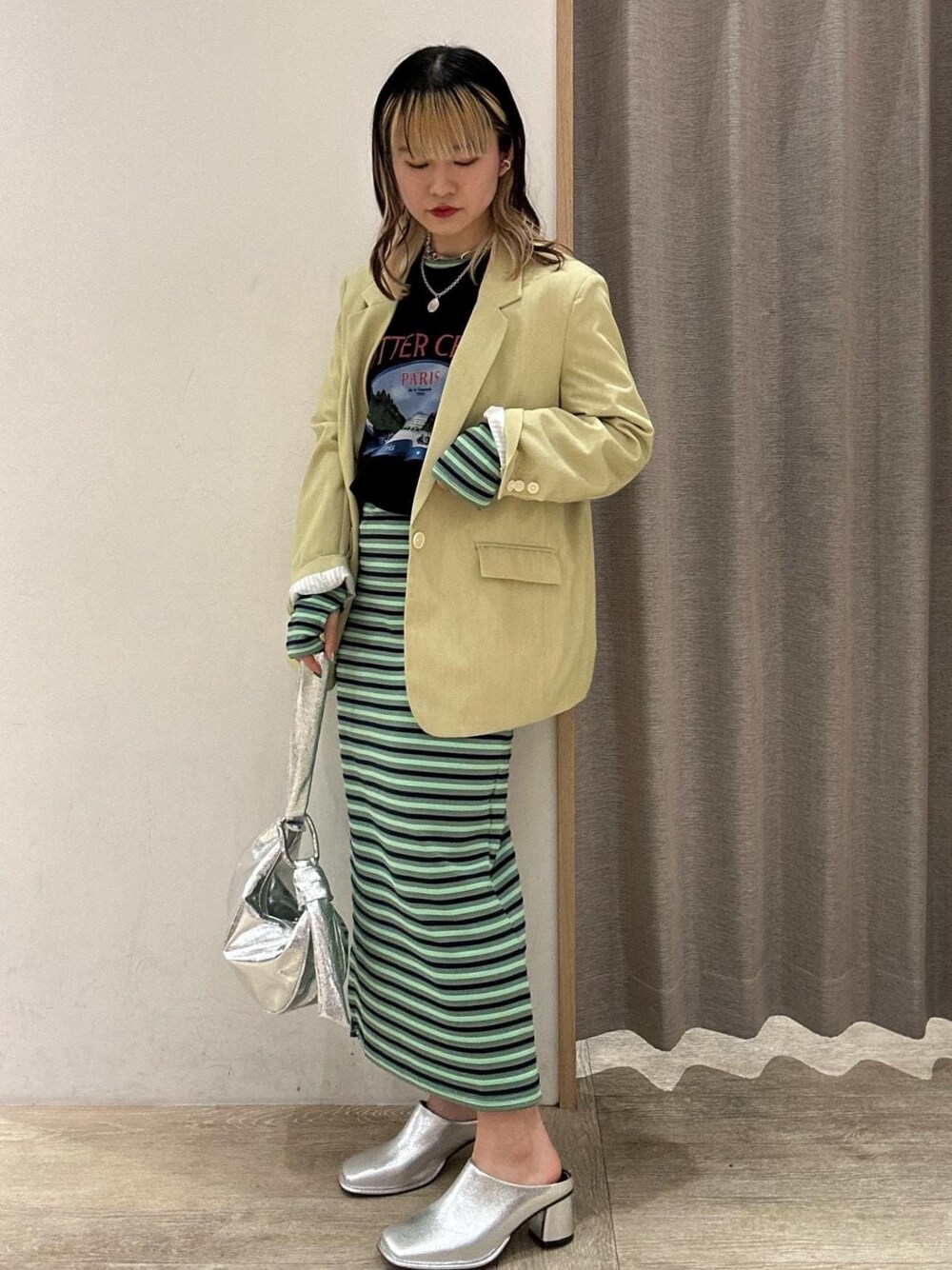 春気分のグリーンコーデです。 春ならではのTシャツ×ワンピースのレイヤード◎ 小物はだいすきなシルバーでまとめました! 1枚目の写真はTシャツの裾を捲って着用しています。 2枚目は裾を伸ばして着ているので着丈やサイズ感の参考にしてください☆彡