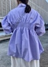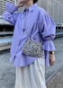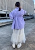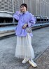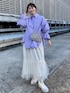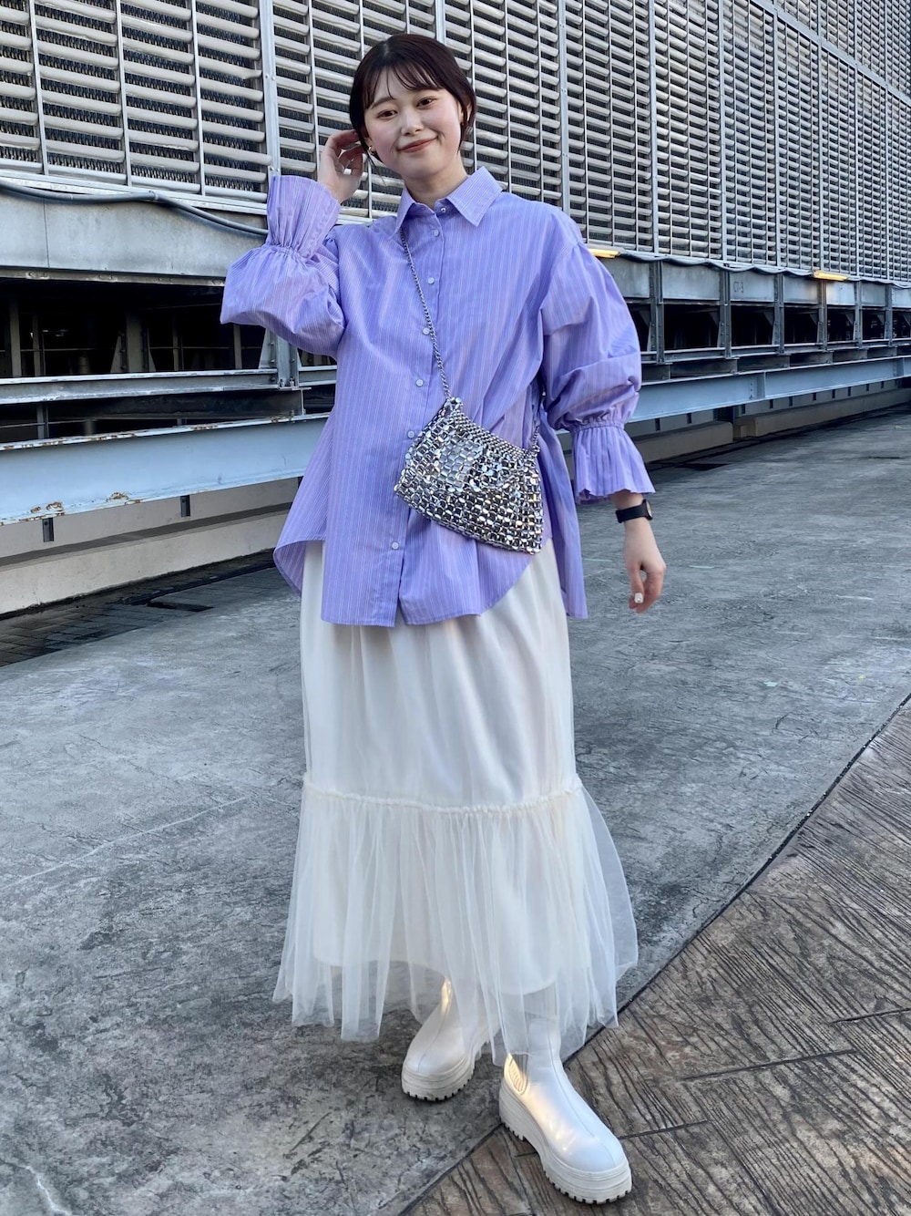 パープルの効いたストライプシャツに、甘めなチュールスカートを合わせ、春先取りのコーディネートにしてみました◎