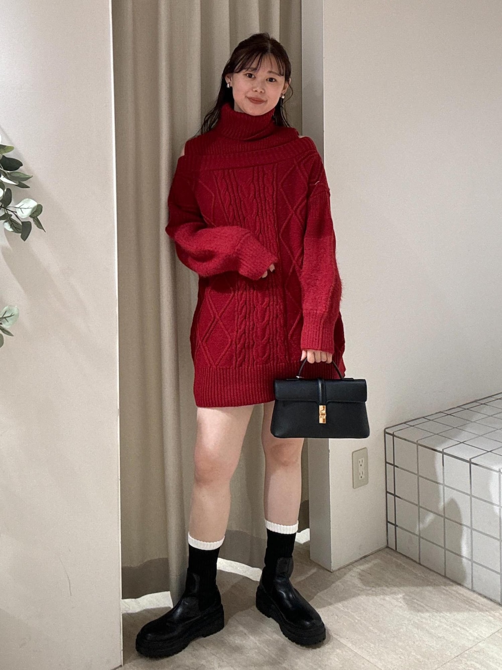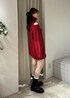 レッドカラーが目を惹く着映えニットワンピースに、インナーはショートパンツで、ブーツとバックはブラックに統一し、カラーが引き立つコーディネートにしてみました!