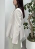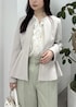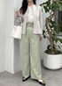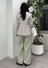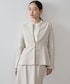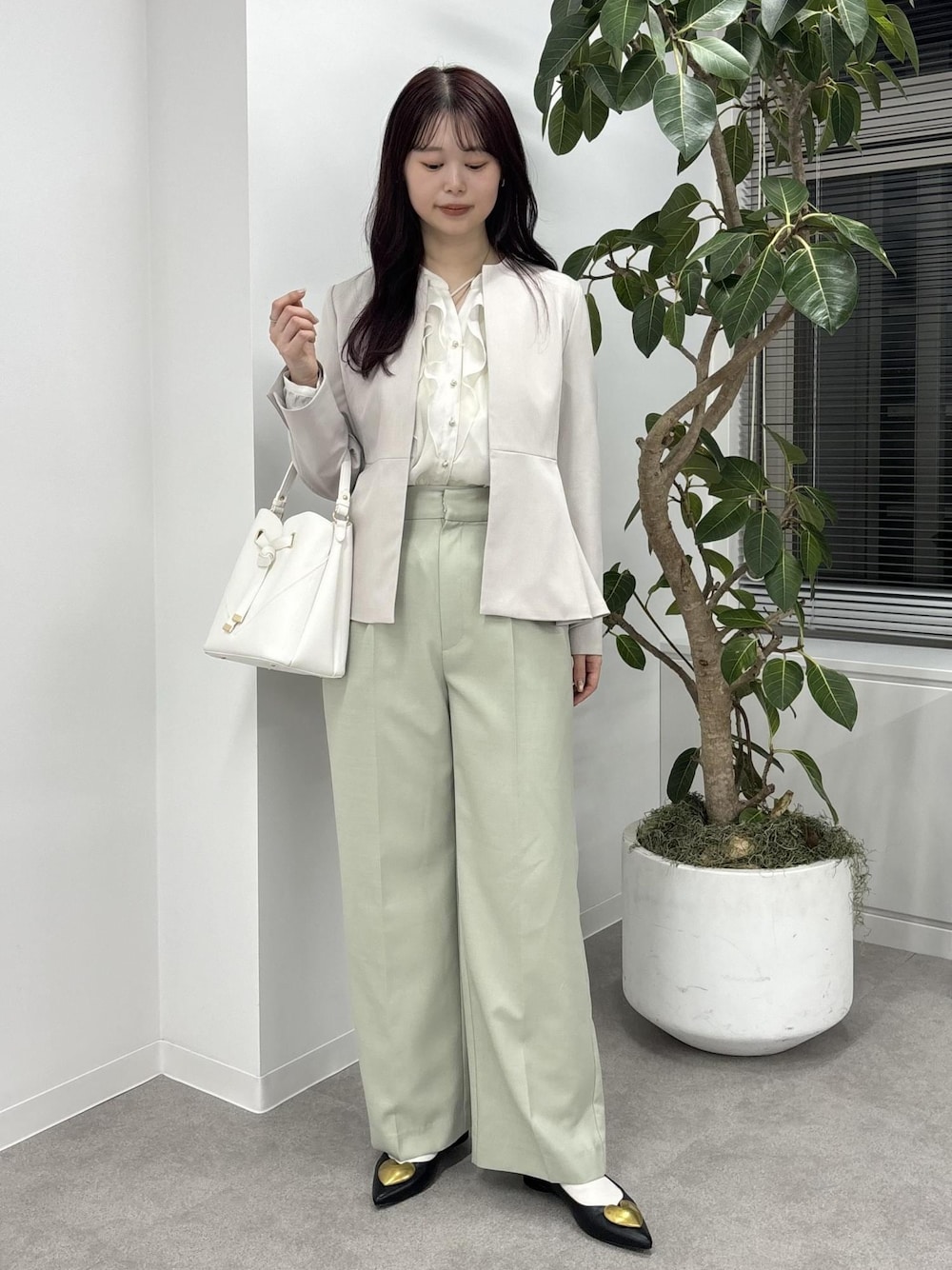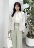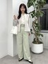 綺麗めなベージュのペプラムジャケットに、フリルブラウスを合わせ、カラーパンツで春らしくベーシックなスタイリングにしてみました。