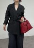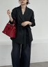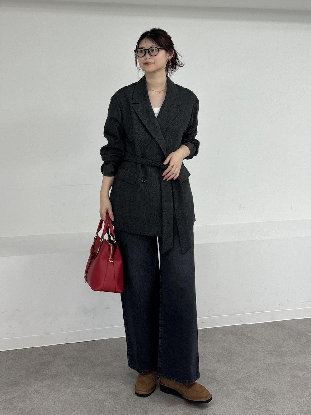 ヘリンボーンのツイードジャケットにかっちりと大人っぽくダークトーンのジャケットを合わせ、小物はレッドを基調に、スエードのローファーで、秋先取りなスタイルに!
