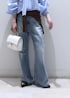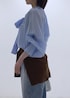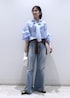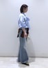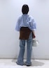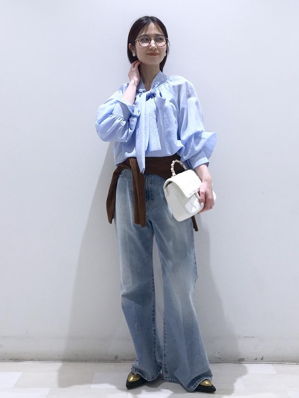 ブルー系のコーディネートにブラウンのカーディガンを腰巻きして、今年らしい色合わせにしてみました。 肌寒い日はカーディガンを羽織って着るのもおすすめです。 コーディネートがシンプルなので、小物はメガネやインパクトのあるアイテムで華やかさを出しました。