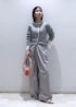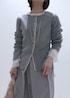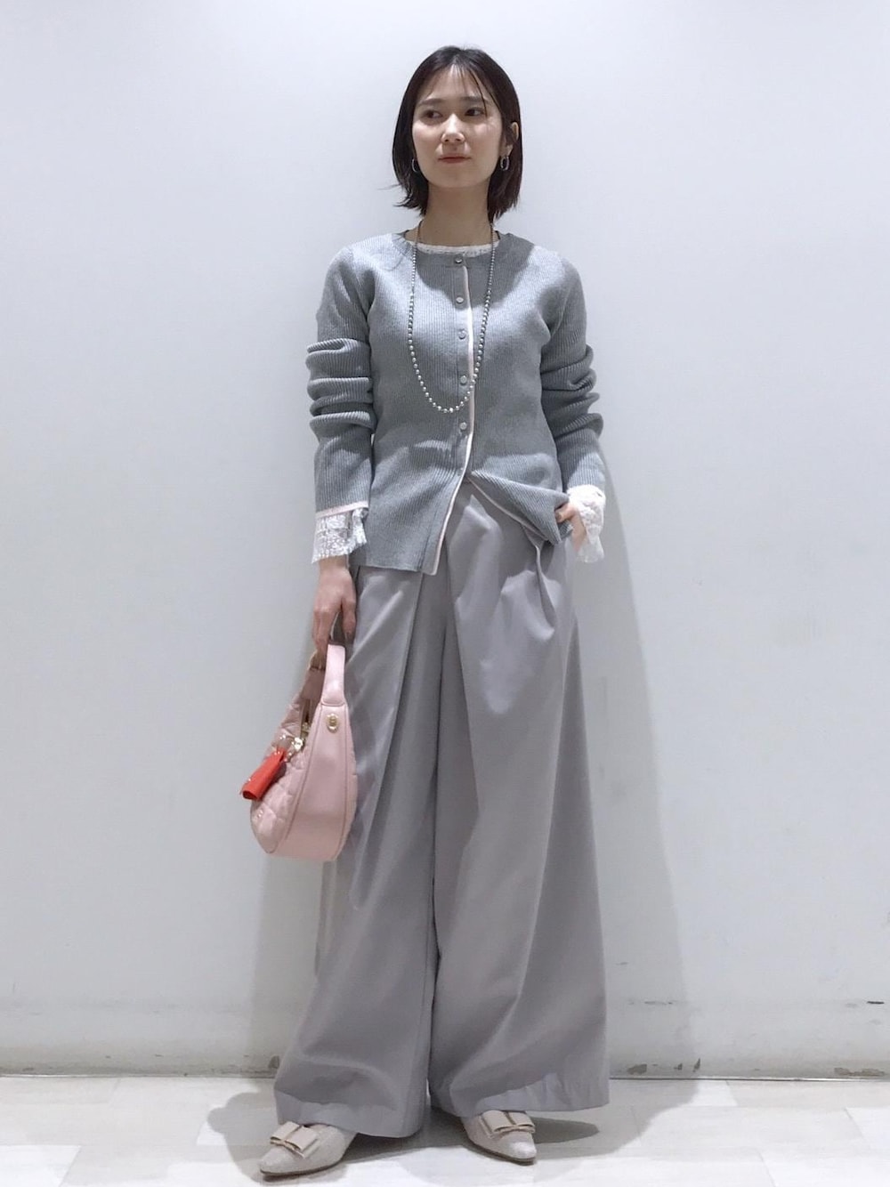 カーディガンの配色に合わせてグレーとピンクで揃えたコーディネート。 ボトムが幅広めのワイドパンツなので、レースやリボンデザイン等で甘さをプラス。 春っぽい配色で優しい印象になります。