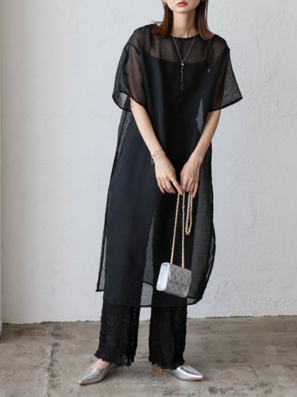 オールブラックでも軽やかに見える、大人ワントーンコーデ。 シアーワンピース×シアーパンツは相性◎ 小物はシルバーで統一し、モードな雰囲気をプラスしました。