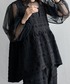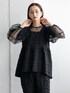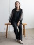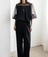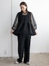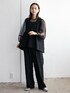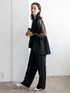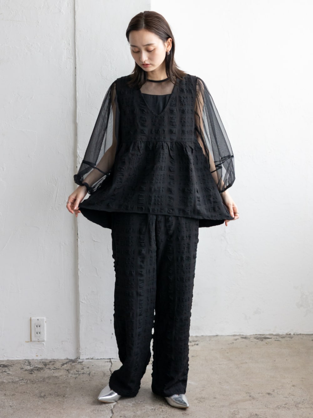 ペプラムベストにシアートップスをレイヤードして、 立体感のあるオールブラックコーデに。 透け感のあるバルーンスリーブが軽やかさをプラスし、 重たくならずに着こなせます。 足元はシルバーシューズでアクセントを効かせ、 モードな雰囲気に仕上げました。