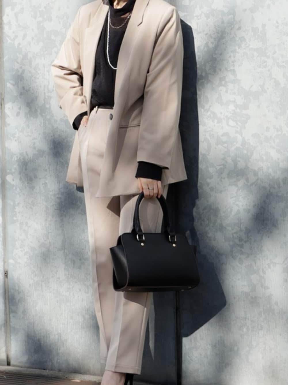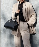 ベージュセットアップで上品かつ柔らかな印象に仕上げたセレモニーコーデ。 インナーにブラックを合わせて全体を引き締め、きちんと感をプラス。 コンパクトなブラックバッグでフォーマル感を高め、入学式・卒業式にも安心の装いに。
