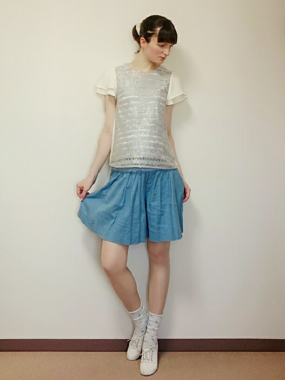 会社いく通勤コーデ。 レースのブラウスに、 angeliebeの通販で買った、 マタニティ用のショートパンツ。 お腹がすごく楽です(^^)w ぜんぶ青系でまとめてみました。 少しは、爽やかに見えるかな?(^^) 会社も、産休はいるまで 残り1週間!がんばる!