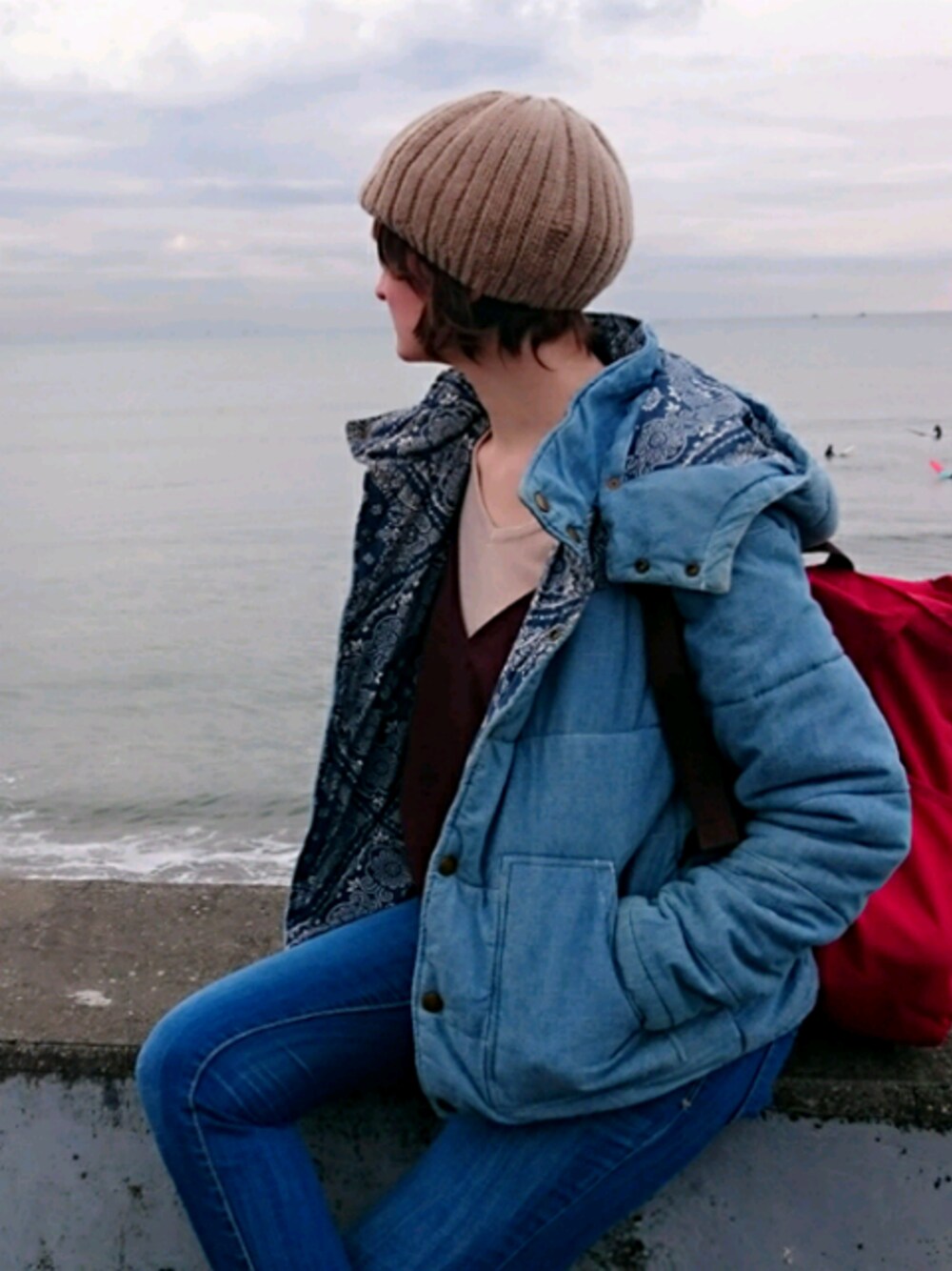 朝いちの海沿いお散歩コーデ。 ビックシルエットのダウンとスキニーデニム。セーターの上にはスエードのキャミを重ねてます。 子供とお散歩すると、なにかと荷物が増えるから、いつもリュック背負ってます(^^)💡