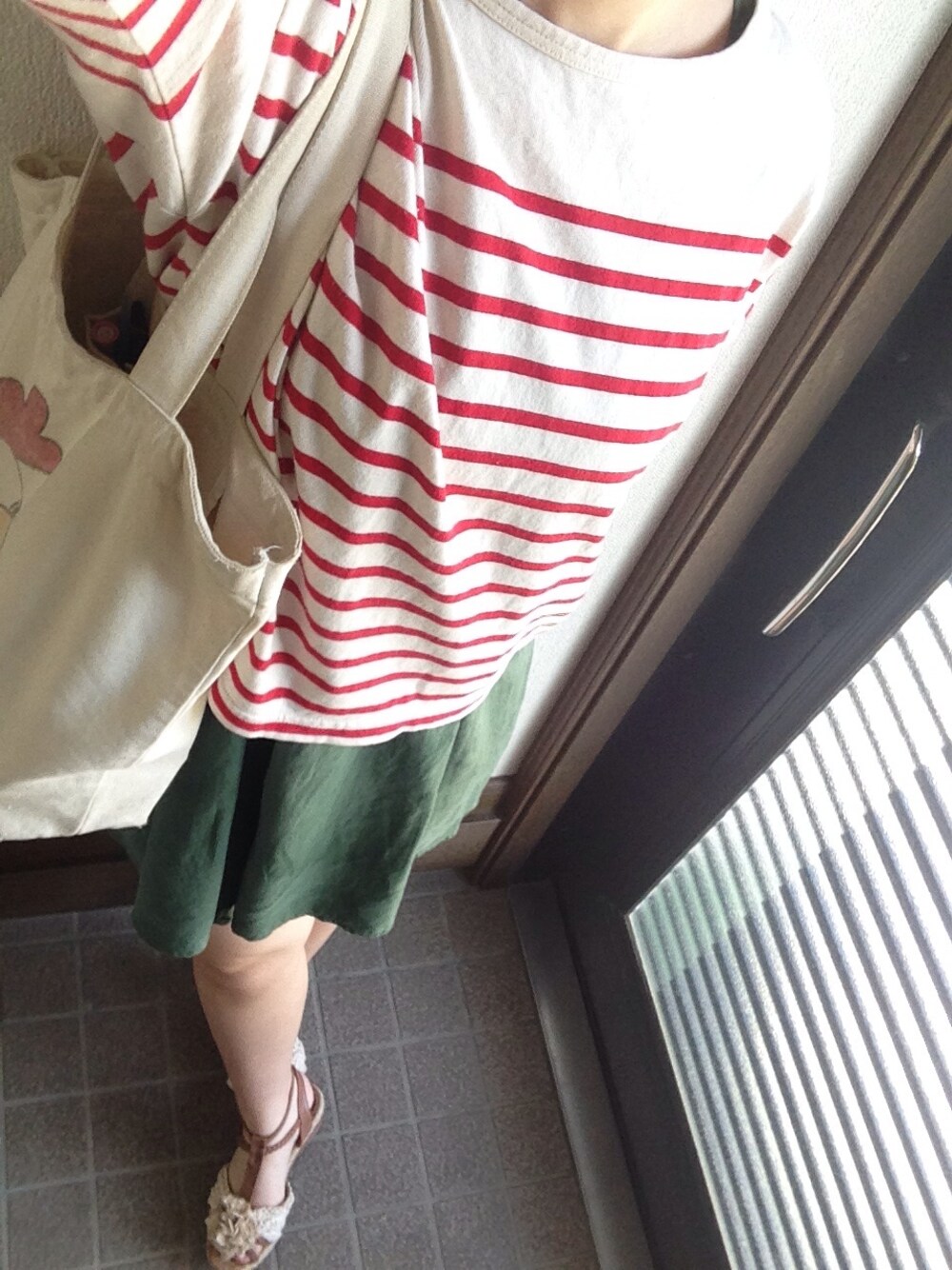 レッド系のTシャツ/カットソー、グリーン系のワンピースを着用したレディースの夏コーディネートの1枚目の写真