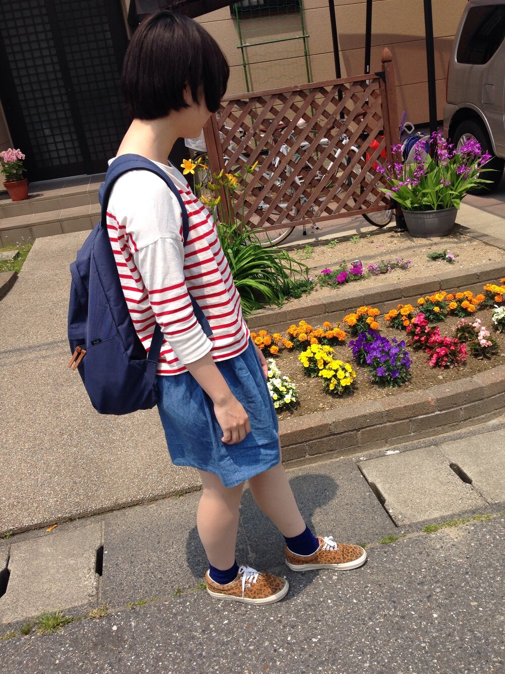 レッド系のTシャツ/カットソーを着用したレディースの春コーディネートの1枚目の写真