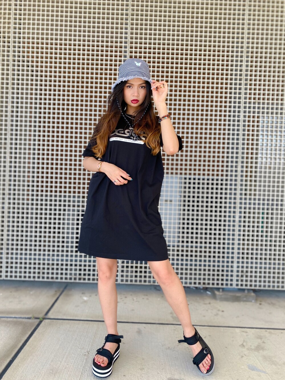 謝名元 麻友美のワンピース「X-girl NYC S/S TEE DRESS」を使ったコーディネート