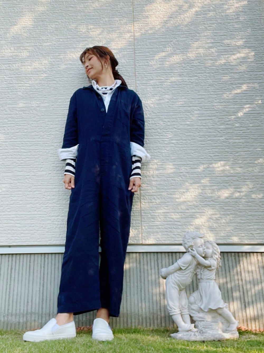 シャツオンシャツ👔 ご覧頂き、ありがとうございます😊 シンプルなアイテムで重ね着コーデ🤗 オールインワンの袖を折って、白シャツとボーダーカットソーを出してみました😊襟元のシャツオンシャツに、自作した白いヴィンテージネックレスがポイントです💍 ゆるっとしたナチュラルなコーデに、レザーシューズで少しひきしめて👟✨