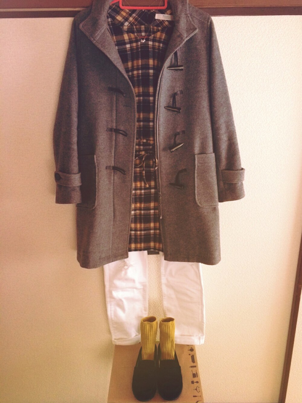 チェックのシャツワンピースに ホワイトのダメージデニムをあわせてみました。 今日着た洋服の色、ネイビー、黄色、白はぜーんぶ好きな色🙌💓