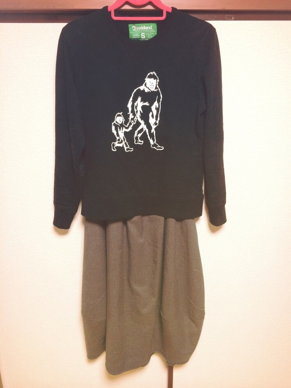 何年も前に買った メンズのSサイズのスウェット 原始人?の仲良し親子☺️笑 スカートは形がお気に入り♡