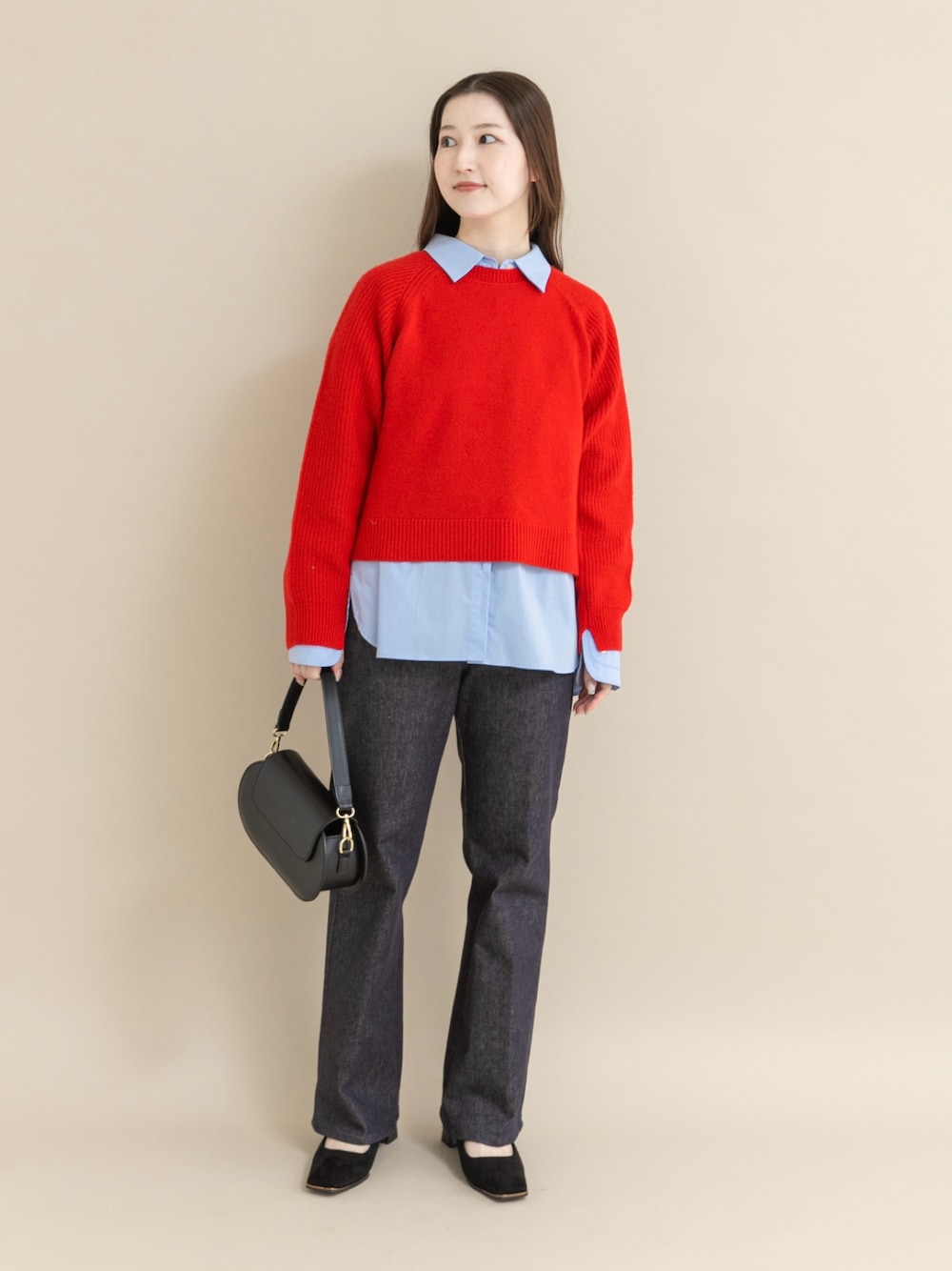 羊毛100%の上質な糸を使用したニット! 軽さと柔らかい肌触りが魅力的。 スッキリとした丈感なので、ボトムスを選ばない万能ニットです◎