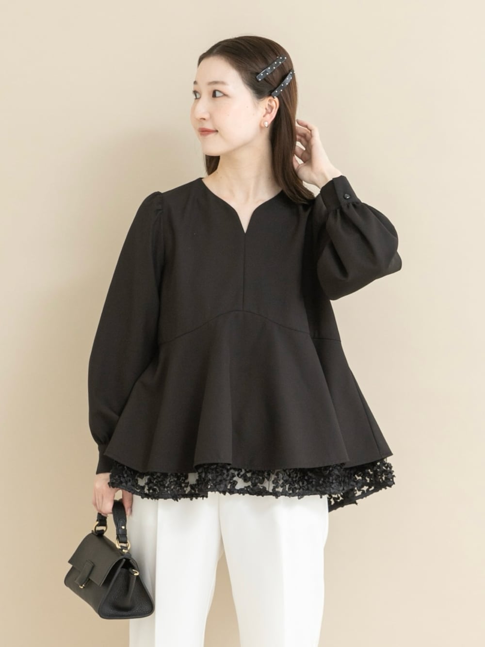 【ROSSOのセレモニースタイル】 セレモニースタイルの定番、ペプラムブラウスがROSSOから登場! スッキリ見えシルエットで、どんなボトムスにも合わせやすいですよ。 レースをレイヤードしたデザインが可愛いオススメブラウスです。