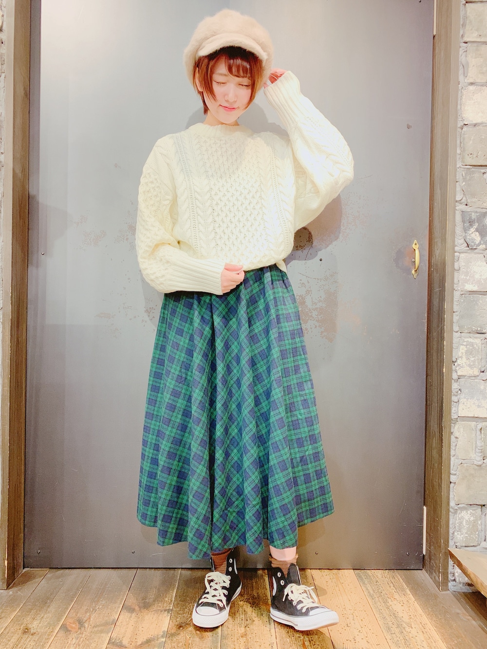 閲覧ありがとうございます😊 今日のコーデは王道白ニットを主役に✨ 流行りのケーブル編みがとっても可愛く、 袖がふわっとしているのもポイントです🙌 こちらはネットに入れてのお洗濯がOKの ニットになりますので、 お手入れも簡単です✨ スカートもウエストゴムで履きやすく、 落ち着いたグリーンが可愛くて とてもおすすめです💗 ニット ¥1990+tax スカート ¥1990+tax