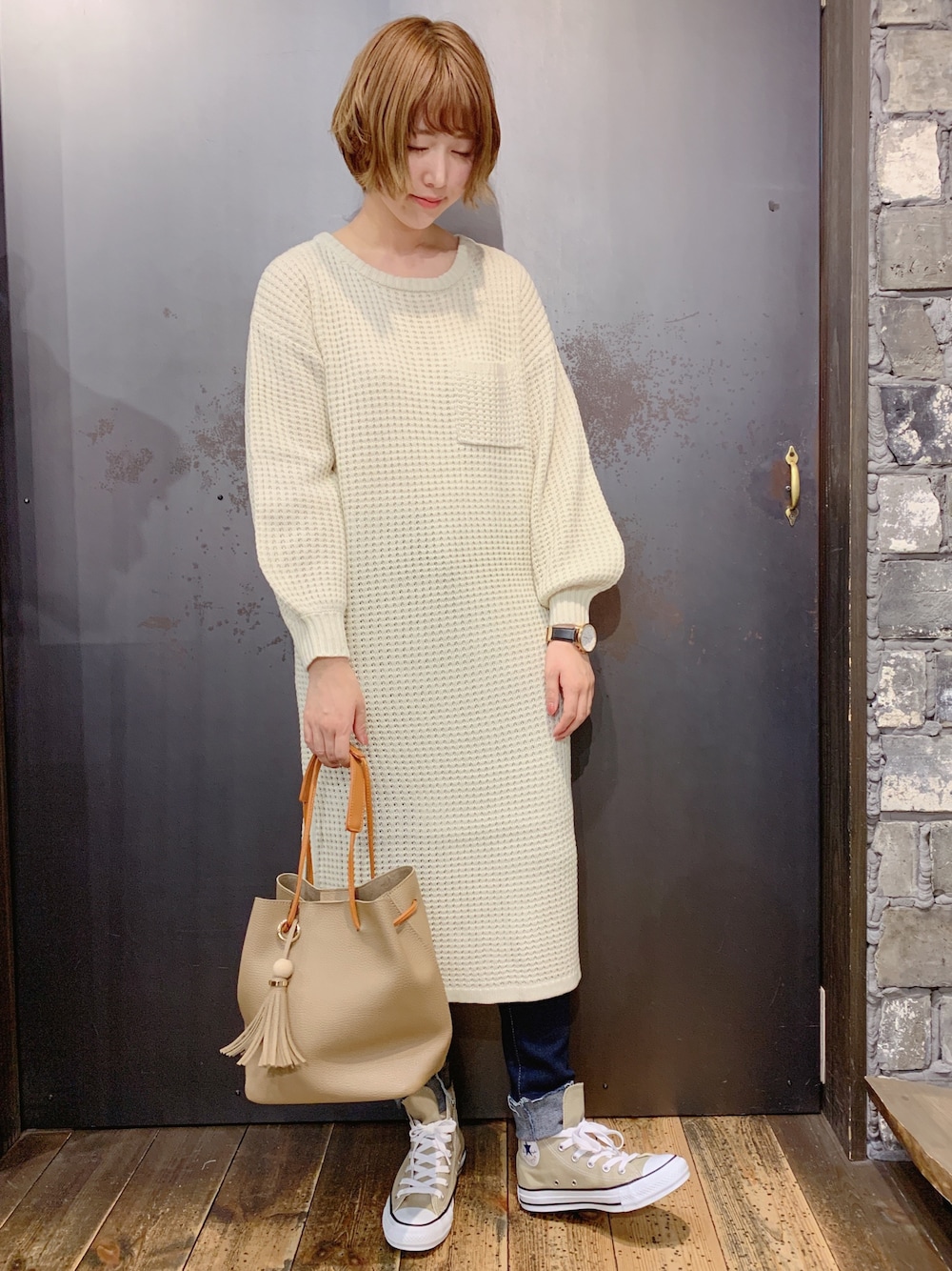 あさぽんのワンピース「ワッフル編みボリューム袖ニットワンピース」を使ったコーディネート