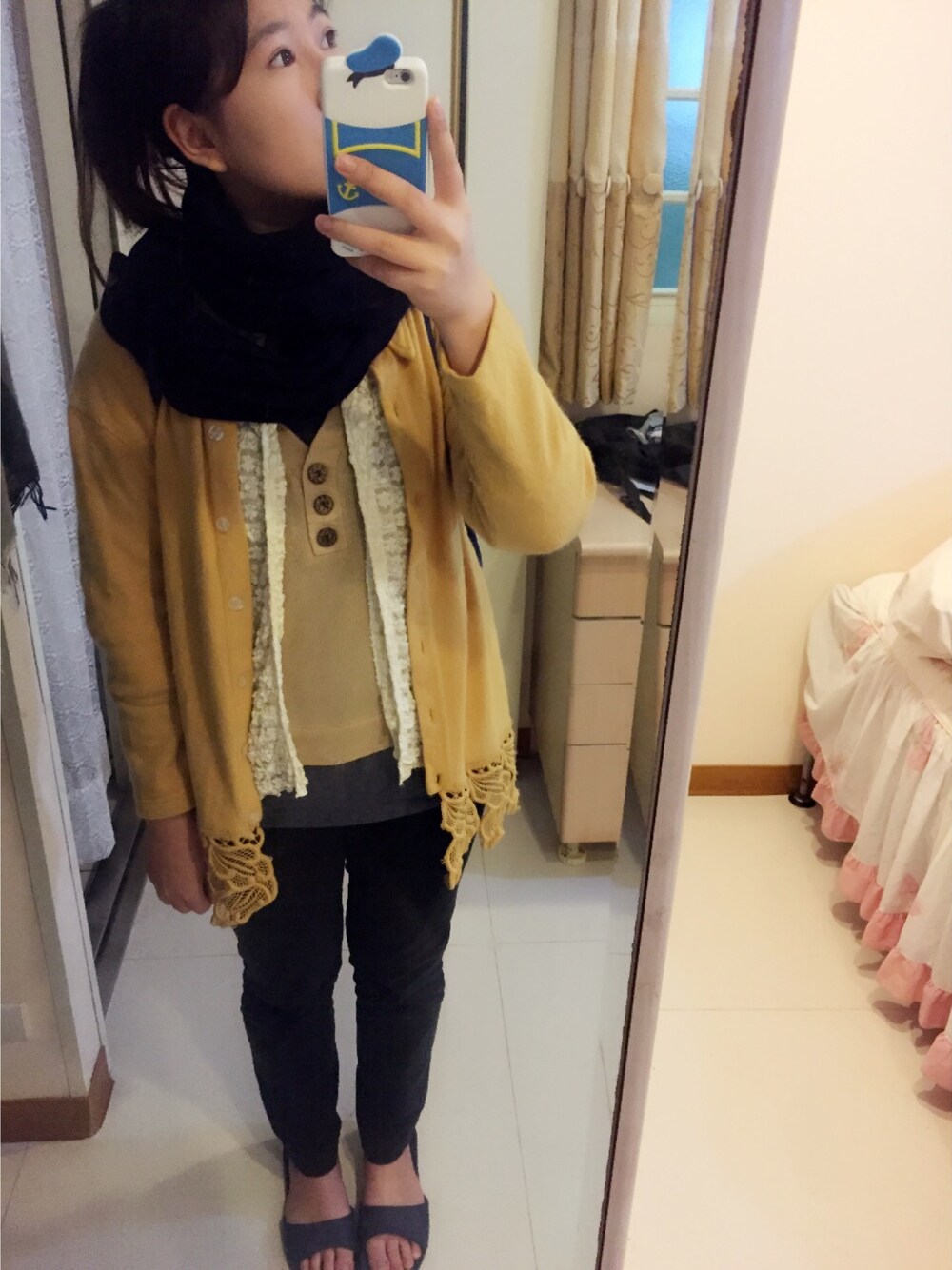 イエロー系のダッフルコートを着用したレディースの冬コーディネートの1枚目の写真