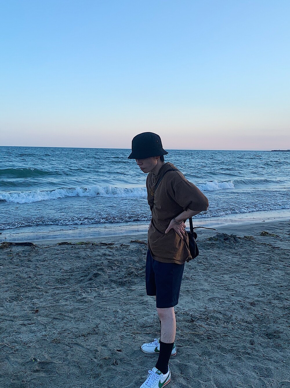 ブラウン系のTシャツ/カットソー、ホワイト系のスニーカー、ブラック系のハットを着用したメンズの夏コーディネートの1枚目の写真