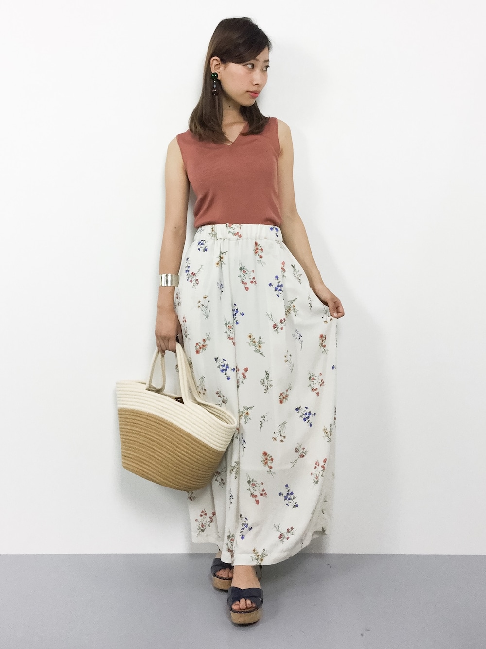 花柄ワイドパンツで、ゆったりラフに◎ 伸縮性のあるトップスは程よくタイトで 透けないので、一枚でも安心して着られます♪ ただいまセール中でお安くなっております‼︎ 大きめのかごバックは 大容量でお荷物がしっかり入るので、夏に重宝しますよね^^