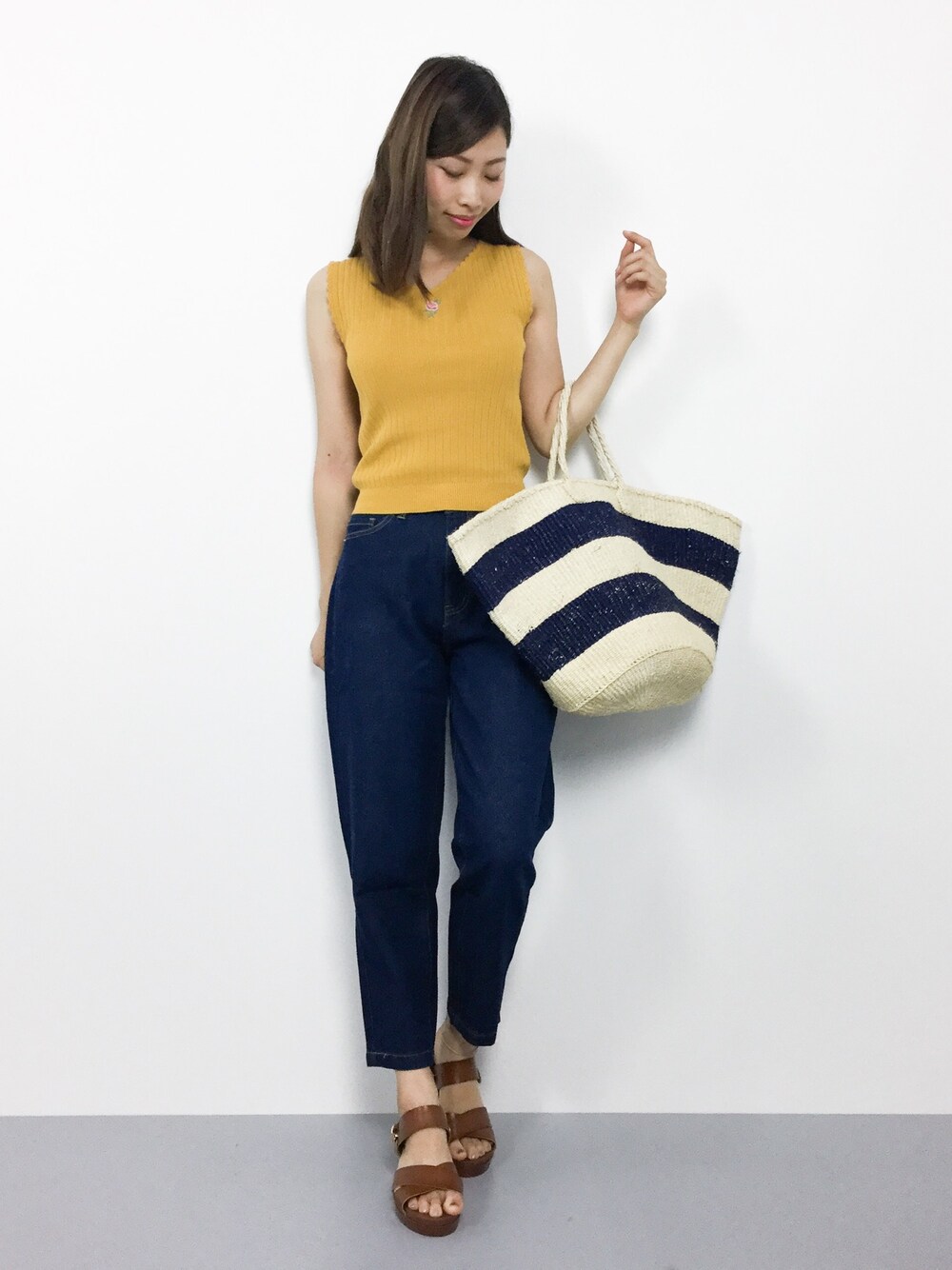 カラバリ豊富なフェミニンタンクトップは イエロー×デニムで、カジュアルに♪ 大きめバッグは夏のお出かけに 大活躍しそうです(^O^)