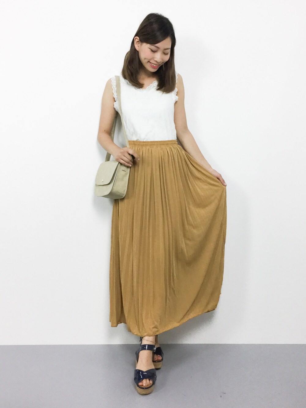アースカラーのフェミニンコーデ♪ 柔らかな生地のプリーツスカートは 履きやすさ抜群です♪
