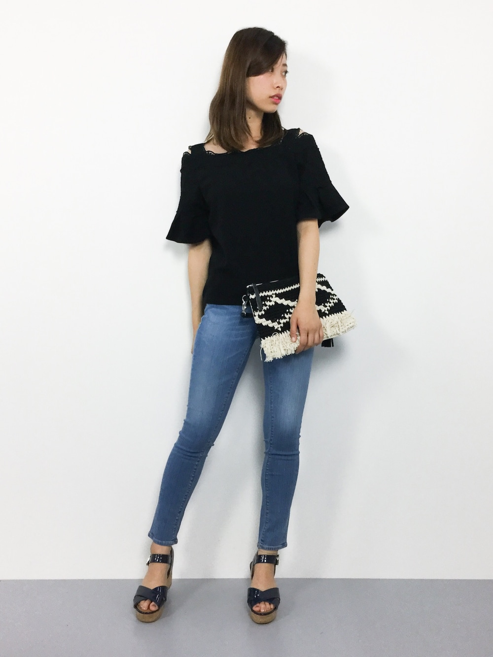 オトナガーリーコーデ◎ 襟周りのレースがガーリーなトップスと、 ストレッチが効いていて穿きやすいデニムは、 どちらもセール商品‼︎ 大変お安くなっておりますので ぜひチェックして下さいね♪